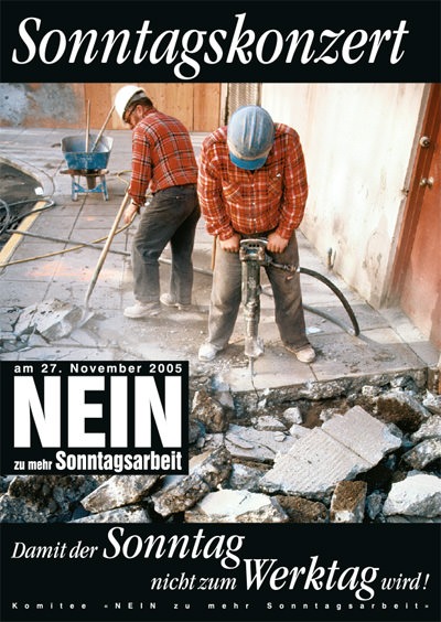 Ironische Postkartenserie zur Abstimmung über die Lockerung des Sonntagsarbeitsverbotes.